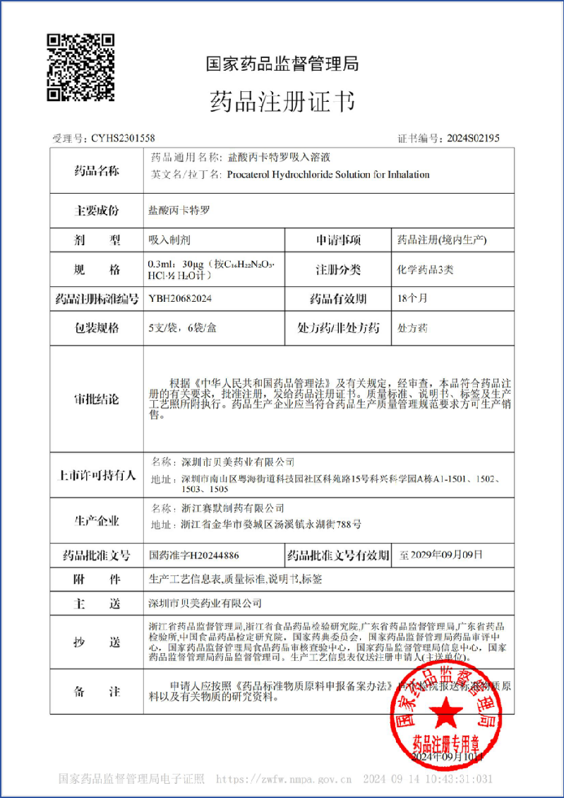 2024年9月14日,深圳市貝美藥業(yè)有限公司申報的鹽酸丙卡特羅吸入溶液(商品名:倍舒捷?)取得國家藥品監(jiān)督管理局(NMPA)頒發(fā)的藥品注冊證書,成功獲批上市 。