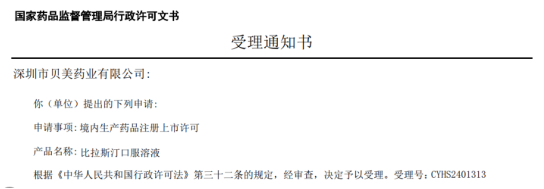 2024年4月29日,深圳市貝美藥業(yè)有限公司(以下簡稱“貝美藥業(yè)”)收到國家藥監(jiān)局下發(fā)的《受理通知書》,貝美藥業(yè)自主研發(fā)的比拉斯汀溶液藥品上市許可申請獲受理。